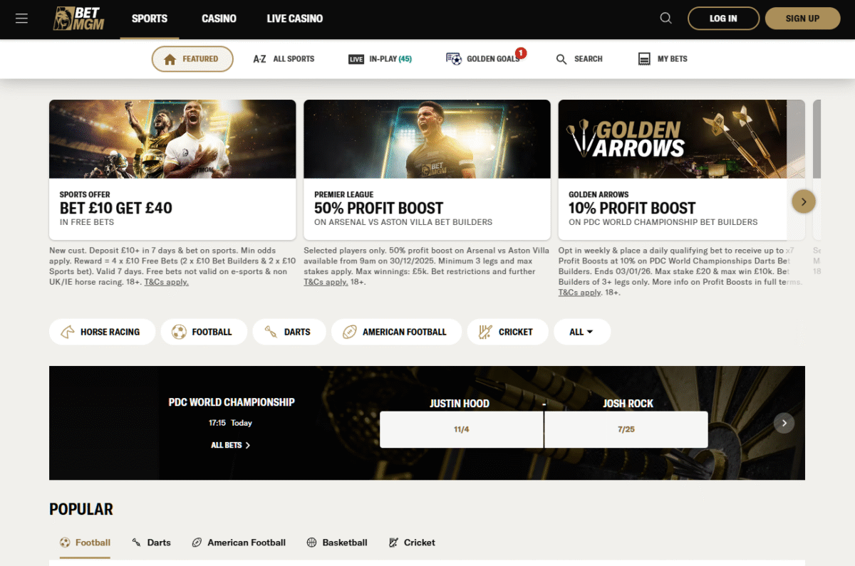 Unlike a lot of betting sites that focus their promos on football and horse racing, BetMGM actually gives darts some love - their regular 'Golden Arrows' offer, for example, doubles your odds on selected tournaments, which is a great touch.