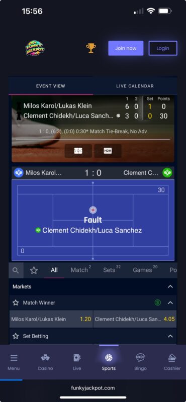 Going by the mobile betting experience, it's not as smooth as the desktop site. It felt a bit more fiddly especially scrolling between different sports betting disciplines. That said, Funky Jackpot does a good job with live betting. The video-game style graphics pulled me in, especially for tennis and international cricket matches. However, at other sites, such as at LiveScore, there were more stats to tuck into, so an area for improvement.