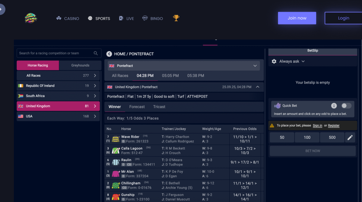 As you will discover, there are other intriguing racing offers, such as First Past the Post, where there are no ifs or buts if your horse wins. In the meantime, Funky Jackpot offers exotic bets, such as forecast and tricasts offered, and there are cursory details about the age and weight of runners, so that is reassuring.