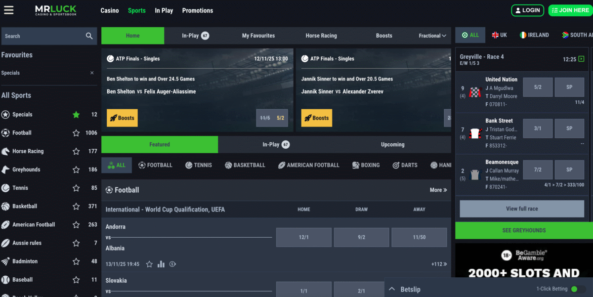With its distinctive green and black hue, Mr Luck echoes stylistic elements associated with 247Bet, albeit 247Bet had a clear promotional carousel running at the top detailing the main sports offers. Naturally, there were some comparisons with other AG-owned sites, such as Luckster and mr.play, in terms of layout, and things weren't cluttered.