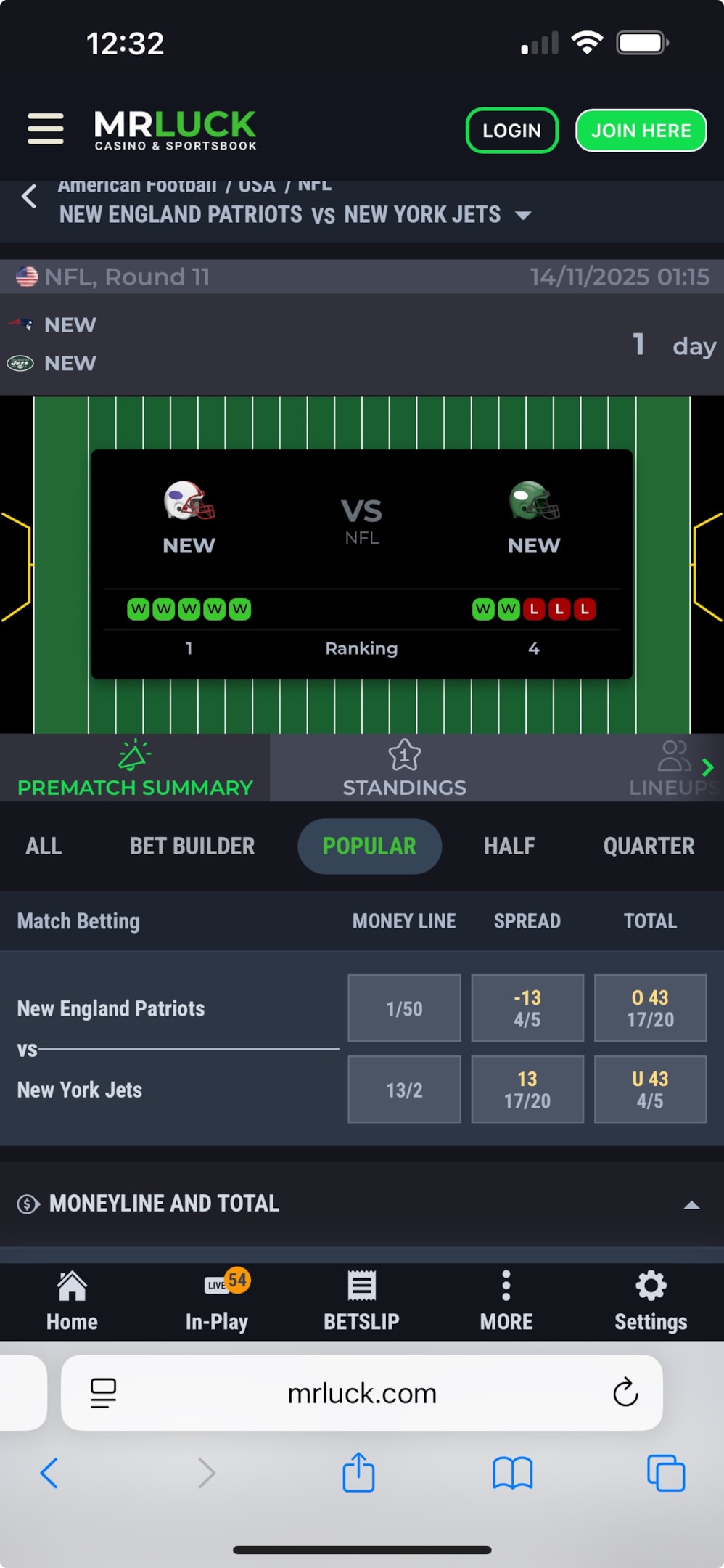 Other than that, there was the same depth and breadth of sports markets on the app as the desktop product. This was illustrated with NFL, and the app was also highly functional. While I haven't seen many reviews published to date, it will no doubt hold sway over time with iOS and Android users, given Mr Luck is a modern and versatile site.