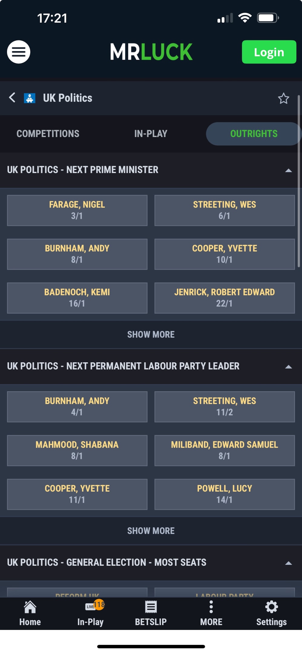 Don't forget about the swathe of specials either at Mr Luck. Although these straddle across politics and non-sporting events, I could place a wager on whether Nigel Farage will be the UK's next Prime Minister or who will win the most seats at the next General Election. This section was plugged with outrights, and it compared favourably with William Hill , who are renowned for delving into specials.