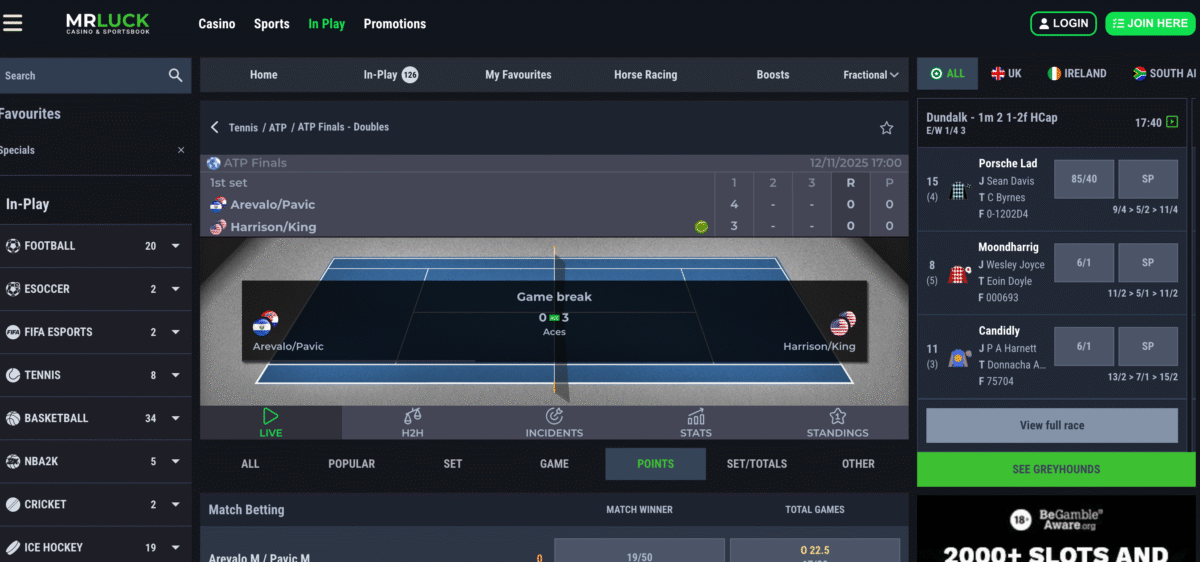 In-play betting is where Mr Luck struts its stuff. A hive of activity, some sports carried well over 100 lines for live markets. You can cash out your bet either in its entirety or partially, and it's refreshing to see how vibrant this section is. Take tennis, for example, you can find a plethora of odds covering set betting, correct score, and point winner, so plenty for me to get my teeth stuck into.