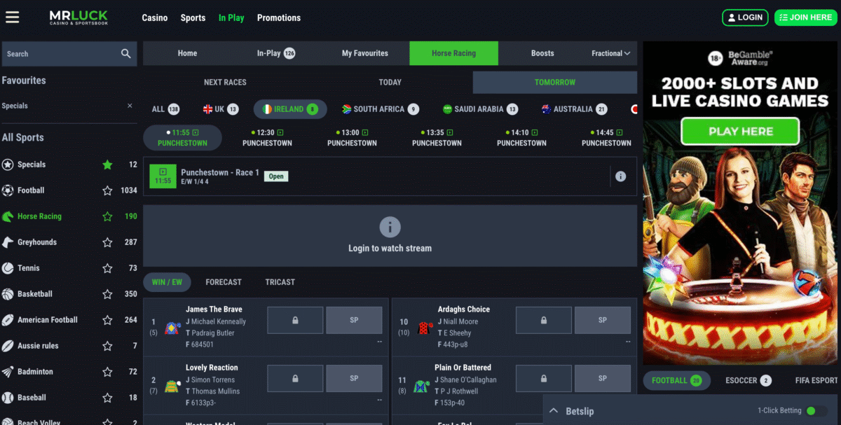When you sign up for Mr Luck, be aware that live streaming is limited to horse racing and greyhounds. Well, to be more precise, I noticed for horse racing, it wasn't available across all UK races. You will need to log in to gain access to the live stream, but there was no mention of needing to have placed a bet in the past 24 hours to enjoy the privilege. Anyway, I will get to horse racing in a later section.