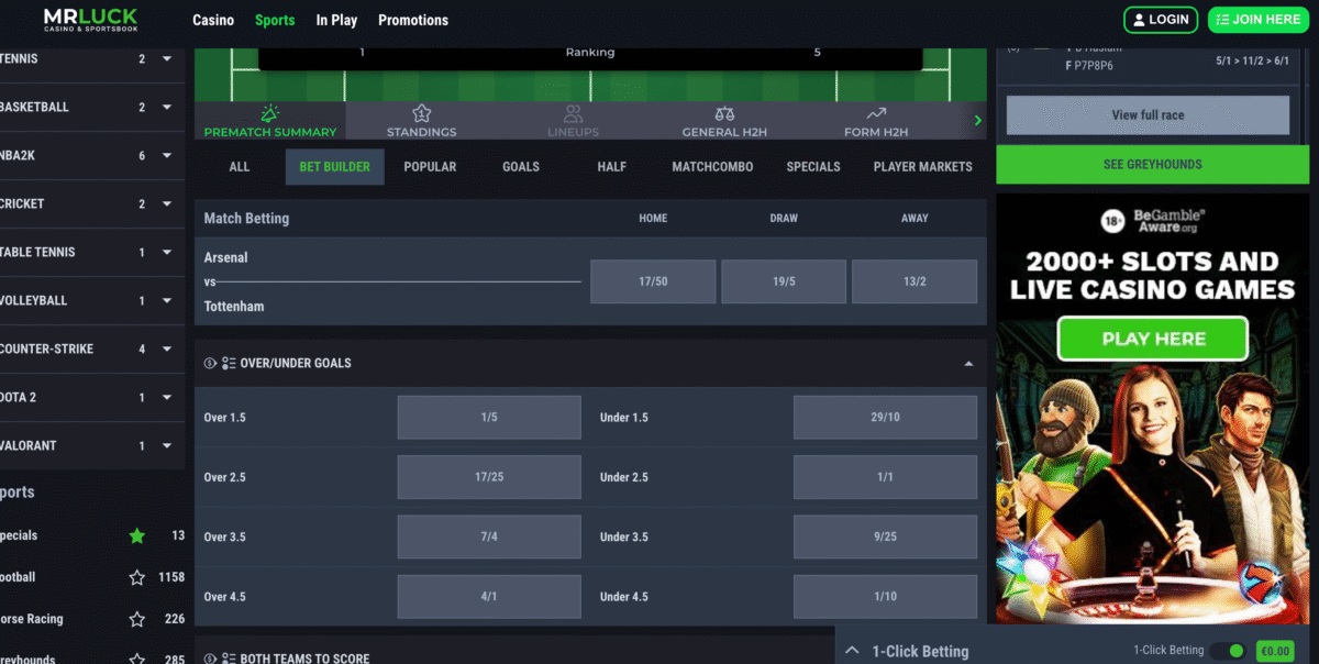 That said, the bet builder feature was highly intuitive. I could compile a smorgasbord of lines, such as Over/Under goals per side, first half totals, winning margins, and more for big upcoming Premier League games, such as Arsenal vs Tottenham. May I also point out I was a big fan of the match combos which I've become accustomed to at new sites such as QuickBet where you can wager on Double Chance and BTTS.