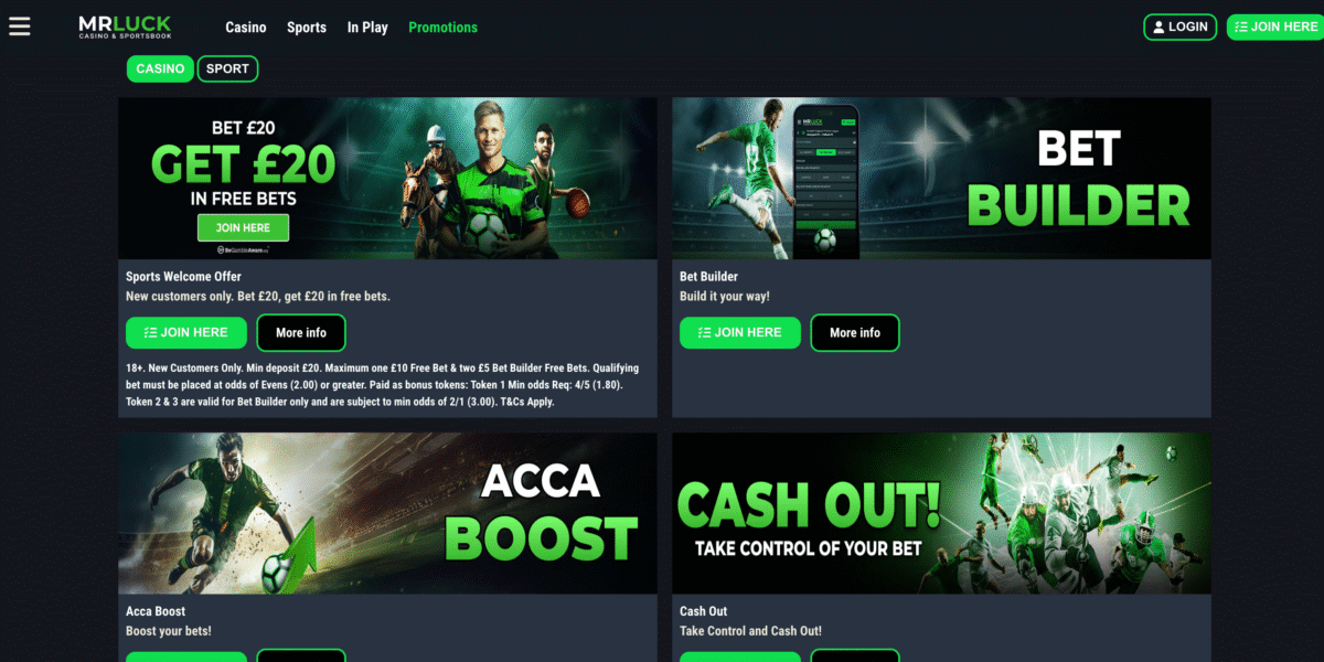 Let's be upfront. Bar the MrLuck welcome offer, there aren't many promotions for punters to latch onto. Perhaps the best thing is the acca boost, where you can get up to a 77% profit boost on accas that have at least 15 selections. Okay, some sites, such as BetMGM offer a whopping 200% accca boost, known as a golden acca boost, but this is still an enterprising deal.