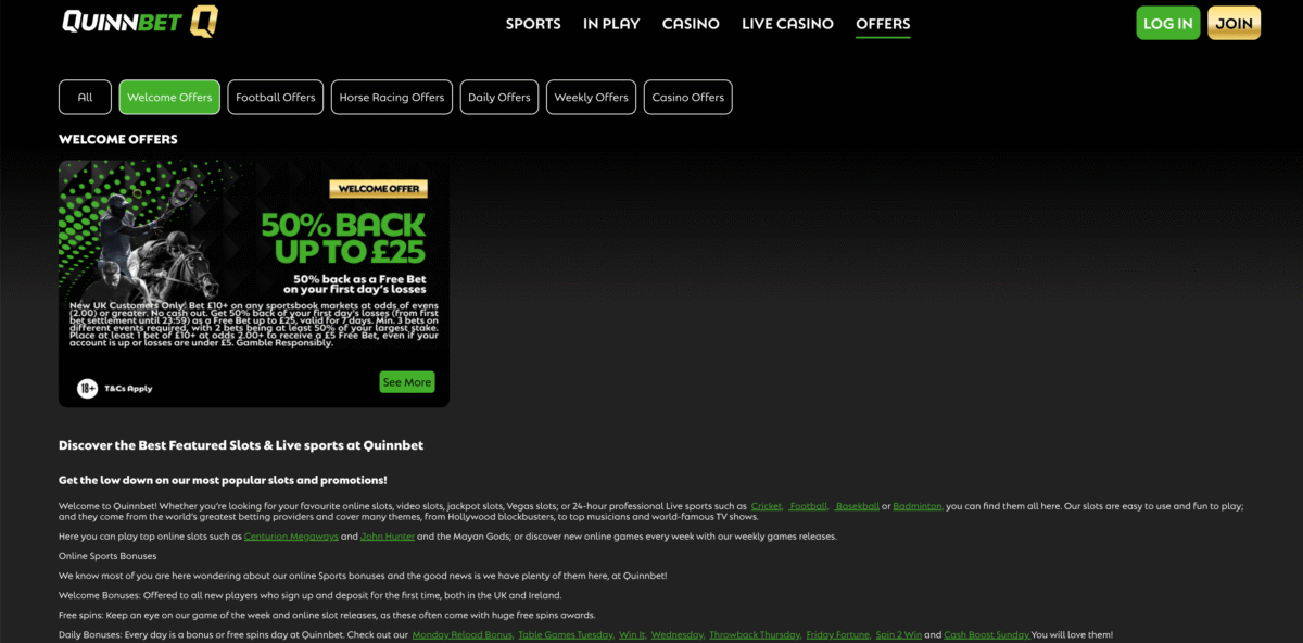 The QuinnBet welcome offer allows you to place qualifying bets, and you can receive up to 50% back up to £25 as a free bet, so you are well looked after.
