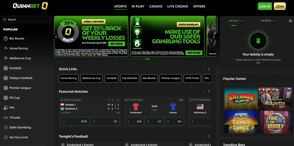 What really helps QuinnBet stand out are its cashback promotions, including their sign-up offer of up to 50% of your first day's losses back as a free bet, giving new users extra value from the start.