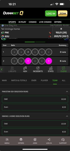 QuinnBet does a decent job with its in-play product, especially in terms of the sports markets offered. This was the case for cricket, where if you wished to place a prop-style bet, there were a gamut of lines available for the biggest competitions, as well as Test matches, ODIs, and T20s.