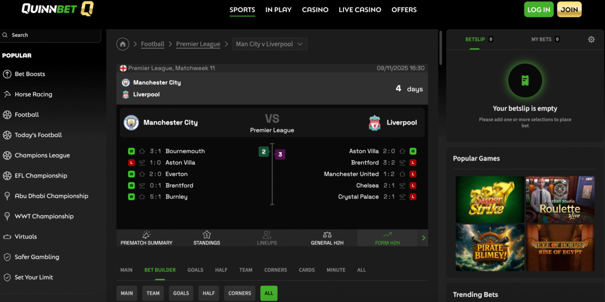 Any QuinnBet based review couldn't be compiled without talking about football. Bet boosts and bet builders are all the rage here, and on average, there were around 161 different Premier League markets to place a bet on per game.
