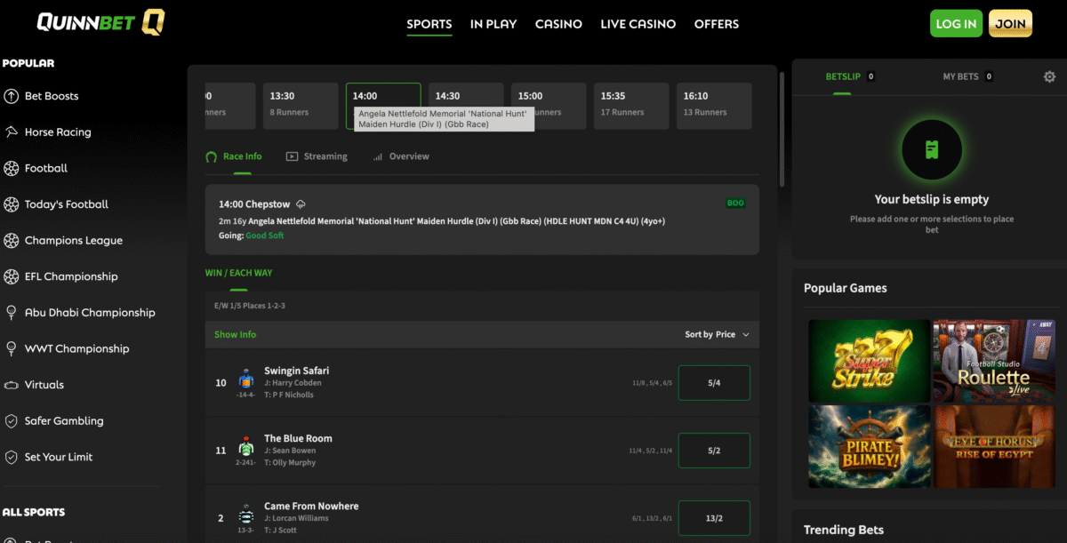 Streaming is available across all UK races, and that includes replays, and QuinnBet has some of the most competitive horse racing odds around.
