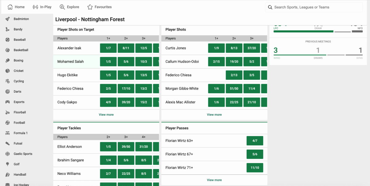 Let's use an upcoming Premier League game between Liverpool vs Nottingham Forest as an example. Apart from a suggested bet builder and compiling a personalised bet builder using a plethora of different markets, the stat betting area provided plenty of scope. I'm not just talking about player shots on target, but you can wager on the number of tackles or passes made during the 90 minutes, which is slightly different from other sites that may just cover anytime or first goalscorer.