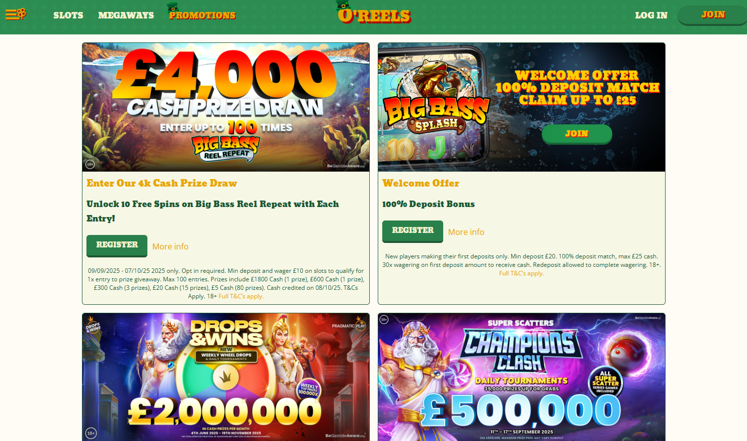 Beyond the welcome package, O'Reels keeps the action going for existing players. During my review, a standout promotion was the £4,000 Cash Prize Draw. By depositing and wagering £10 on slots, I earned an entry into the draw, with each entry also granting 10 free spins on Big Bass Reel Repeat.