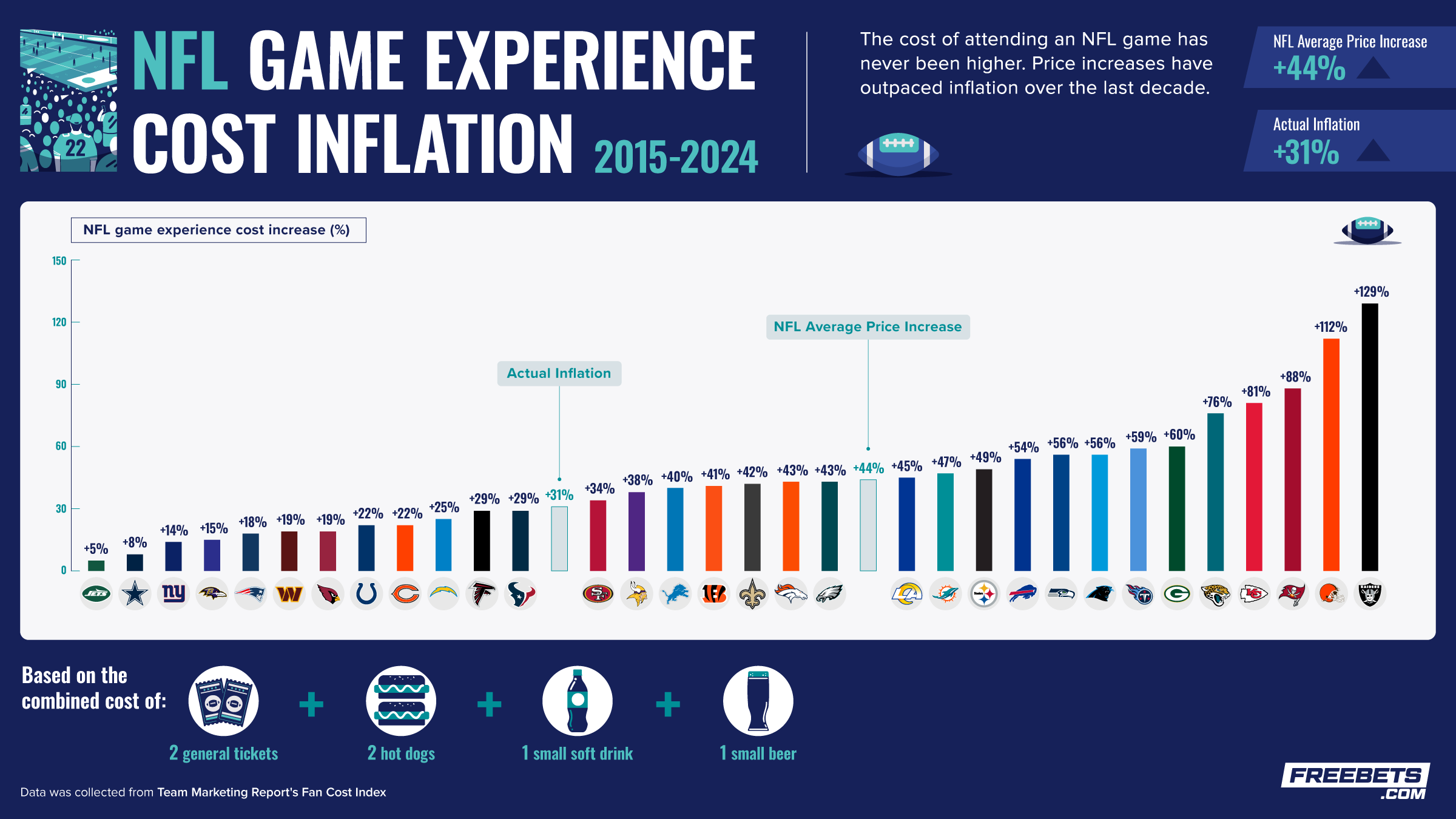 - NFL teams who have most increased the overall price of attendance include Las Vegas Raiders (+129%), Cleveland Browns (+112%), and Tampa Bay Buccaneers (+88%)