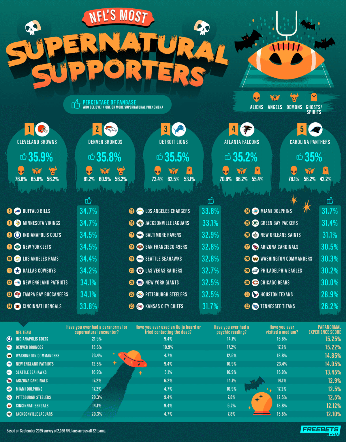 So we wondered: if fans are that superstitious about football, what else do they believe in? Ghosts? Aliens? Conspiracies? To find out, the team at Free Bets listened to over 2,000 fans across all 32 teams to find out which fanbases believe in ghosts, aliens, and things that go bump in the fourth quarter.