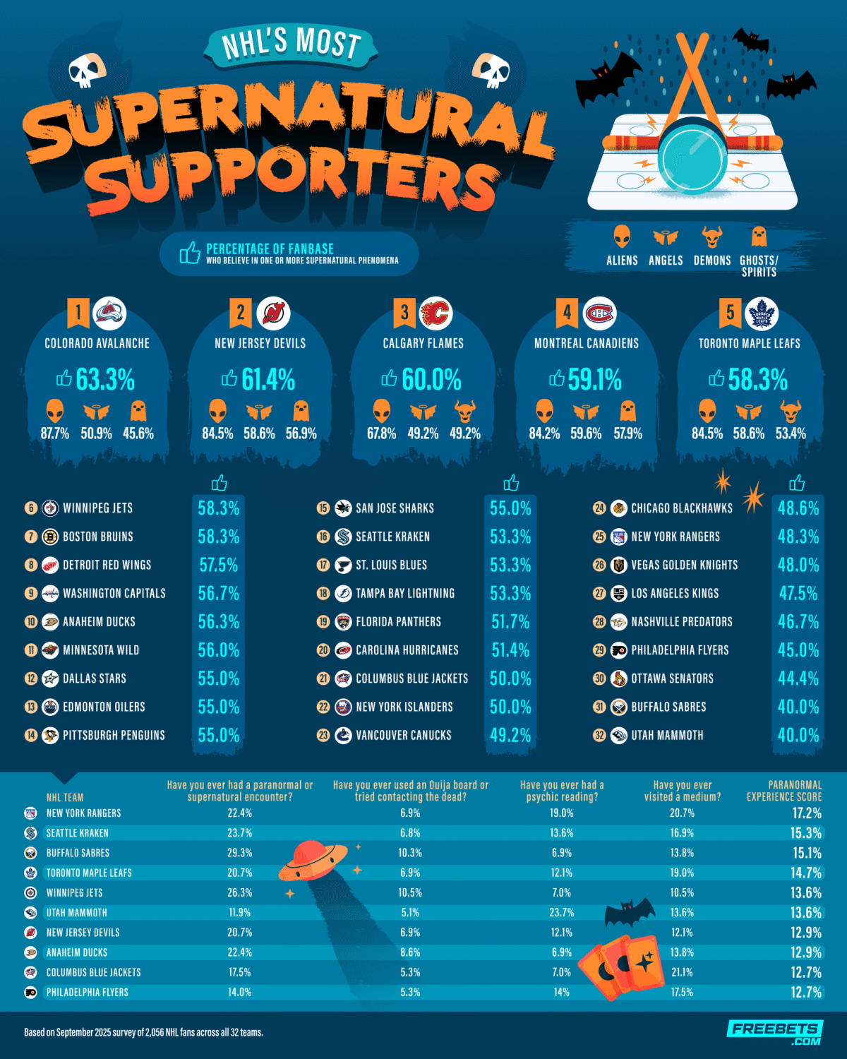 If you're looking for the NHL's true โsupernatural supportersโ, head to the Rocky Mountains. Colorado Avalanche fans don't just believe in their team's chances at another Cup โ they believe in pretty much everything supernatural. With an average belief rate of 63.3% across all paranormal phenomena, they're the most superstitious fanbase in hockey by a significant margin.