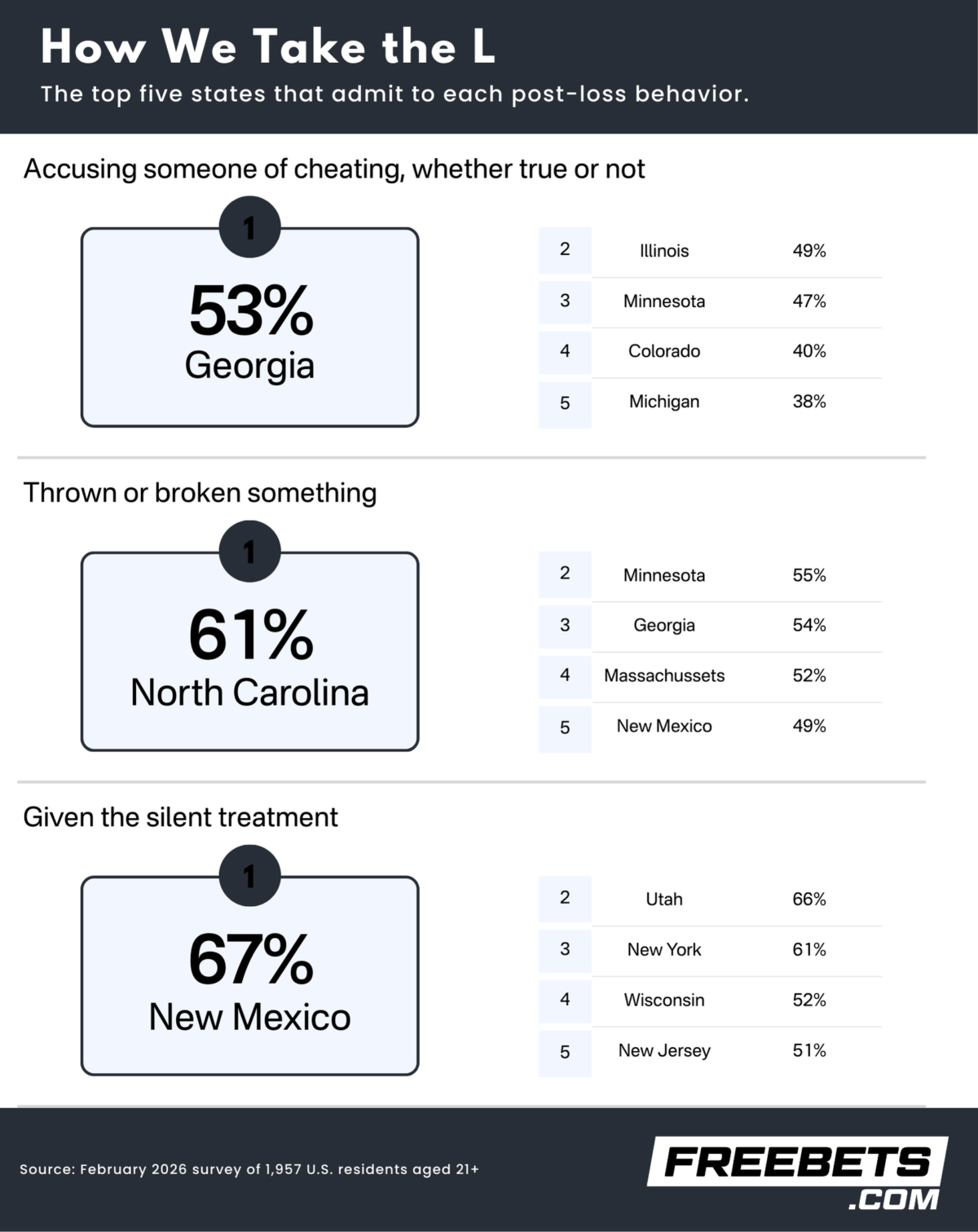 When it comes to accusing someone of cheating, Georgia leads again at 53%, followed by Illinois (49%) and Minnesota (47%). Over in the property damage department, 61% of North Carolinians admit to throwing or breaking something after a loss. Minnesota (55%) and Georgia (54%) aren't far behind.