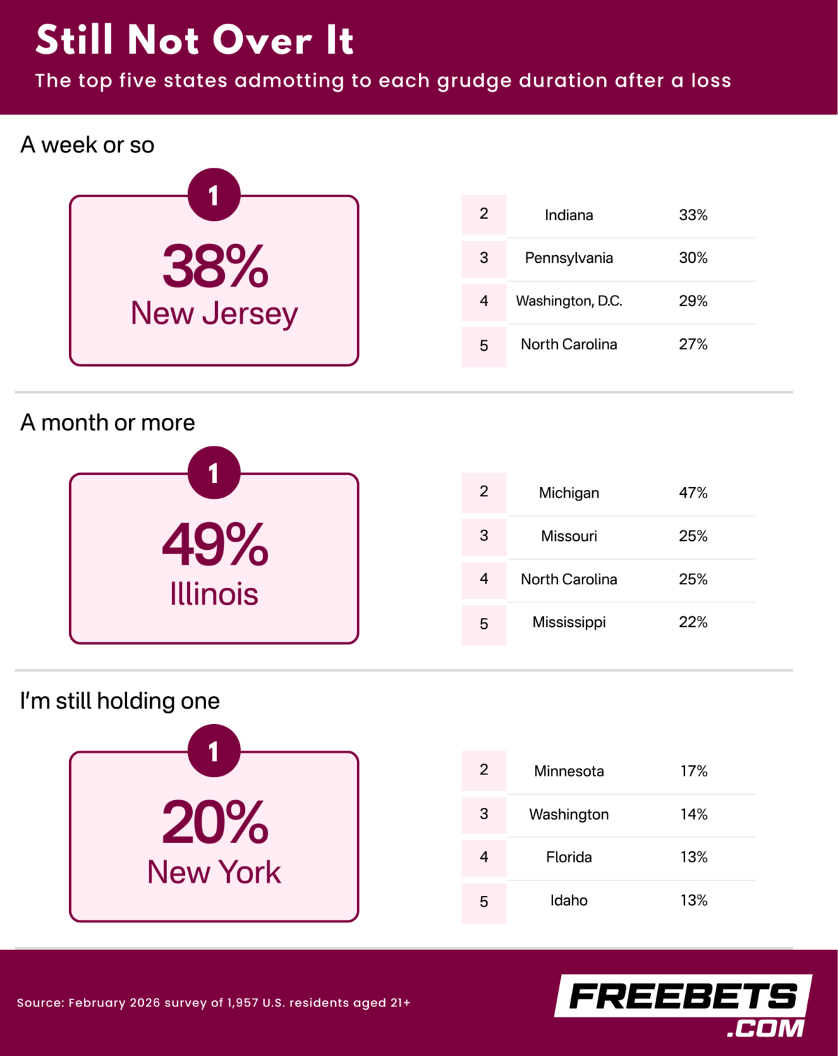 A full 20% of New Yorkers say they're currently holding a grudge over a competitive loss. Right now. Today. Minnesota (17%) and Washington (14%) round out the top three for active, ongoing resentment. For grudges lasting a month or more, Illinois leads at 49%, with Michigan (47%) not far behind. And for the "give me a week" crowd, New Jersey tops the list at 38%.